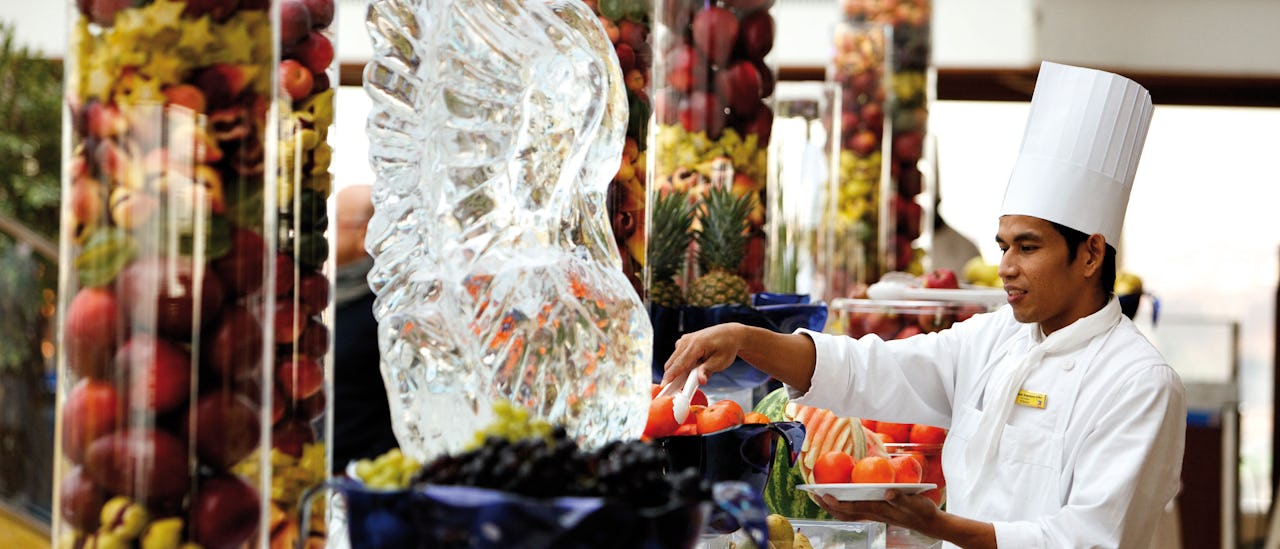 Á la carte-matsalen ingår tillsammans med buffetrestaurangen. Dessutom finns flera specialrestauranger – och en gelateria