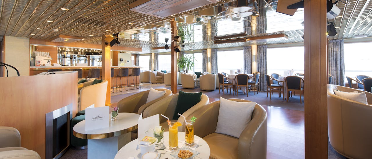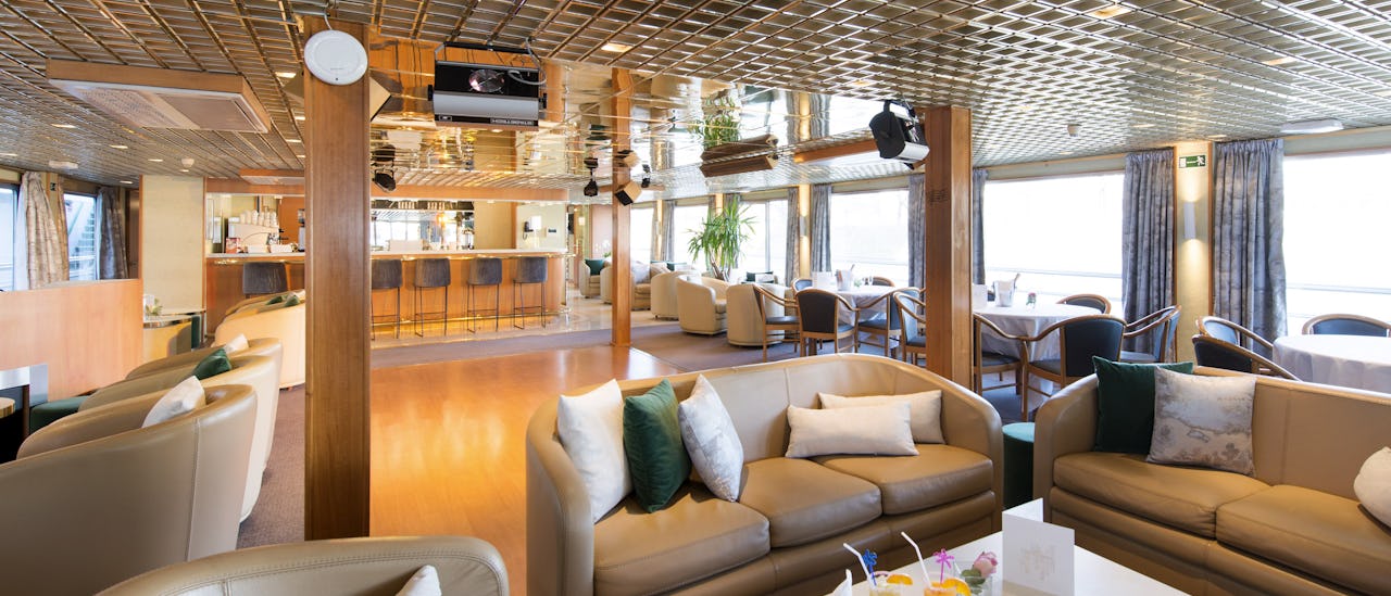 Loungen är smakfullt inredd och ligger på framsidan av fartyget och erbjuder panoramautsikt. Cocktails och spel, dans och andra former av underhållning sker här.