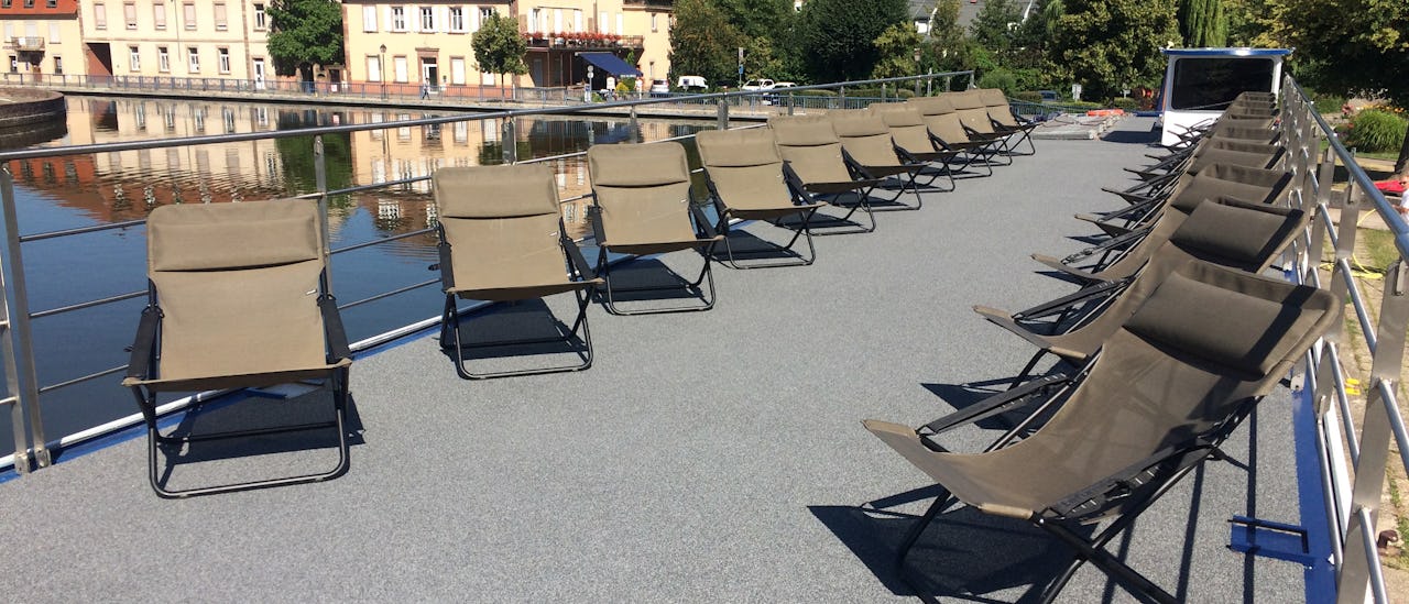 Koppla av och njut av utsikten över det bildsköna landskapet på soldäcket med stolar och solstolar.