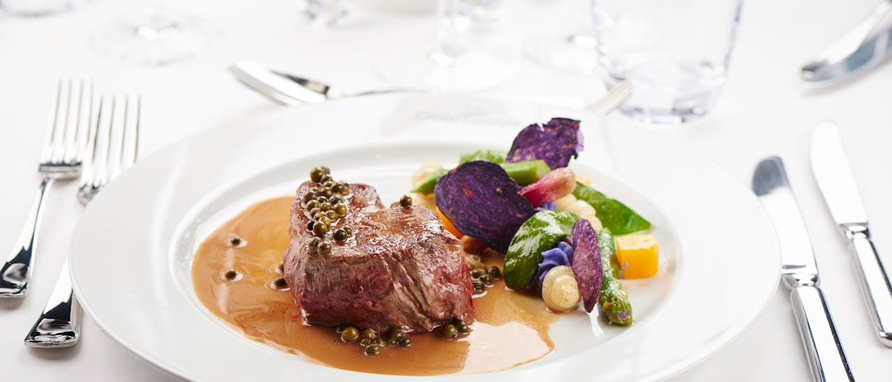 Alla måltider serveras i huvudmatsalen, vilket skapar en avslappnad men elegant atmosfär. Menyn består främst av fransk matlagning med några rätter inspirerade av lokala smaker.