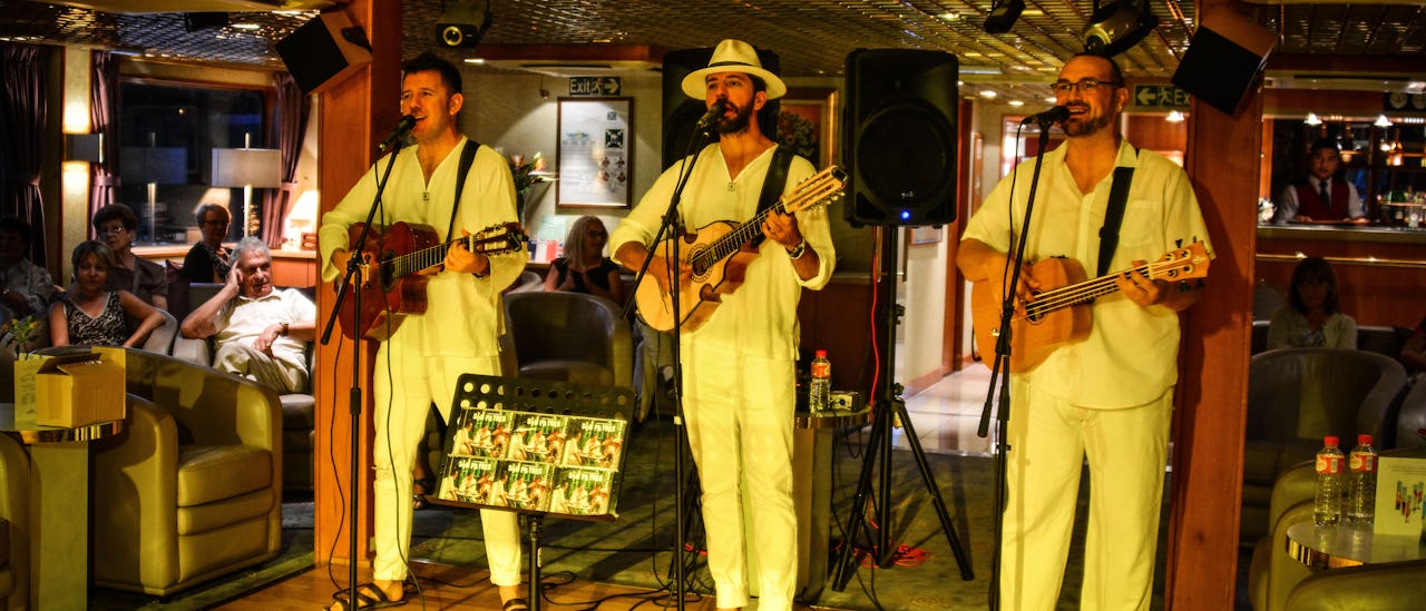 Lyssna på och dansa till livemusik i huvudloungen, belägen främst på fartyget.