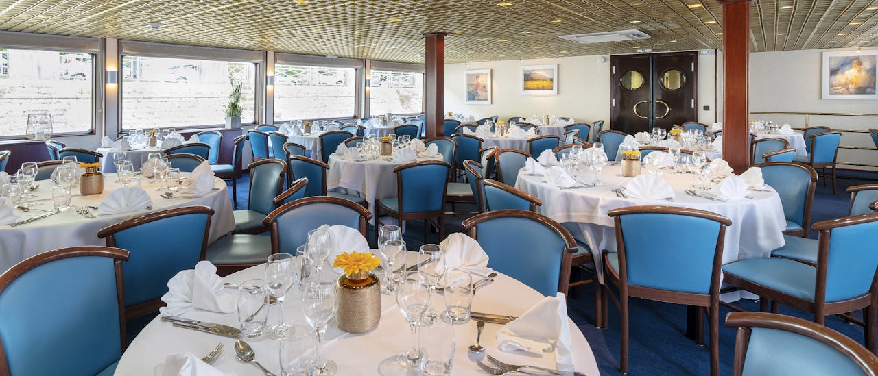 Restaurangen, som ligger på övre däck, är där alla måltider serveras under din kryssning. Atmosfären är avslappnad men elegant.