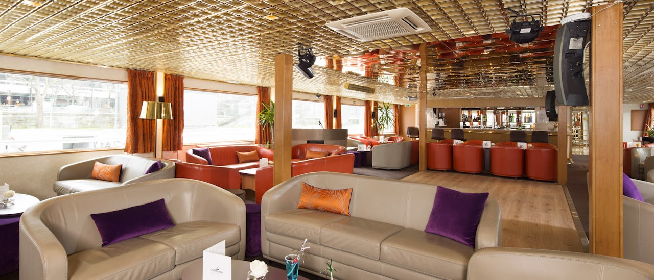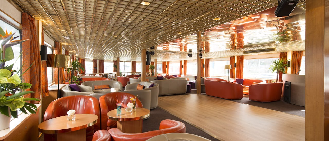 Lyssna och dansa till livemusik i huvudloungen belägen i fören på fartyget.