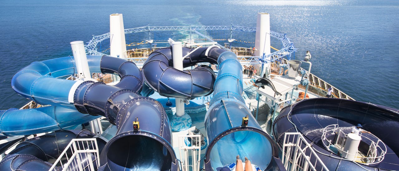 Pooldäcket är uppdelat i två områden med pooler som tillhör de allra största till havs.