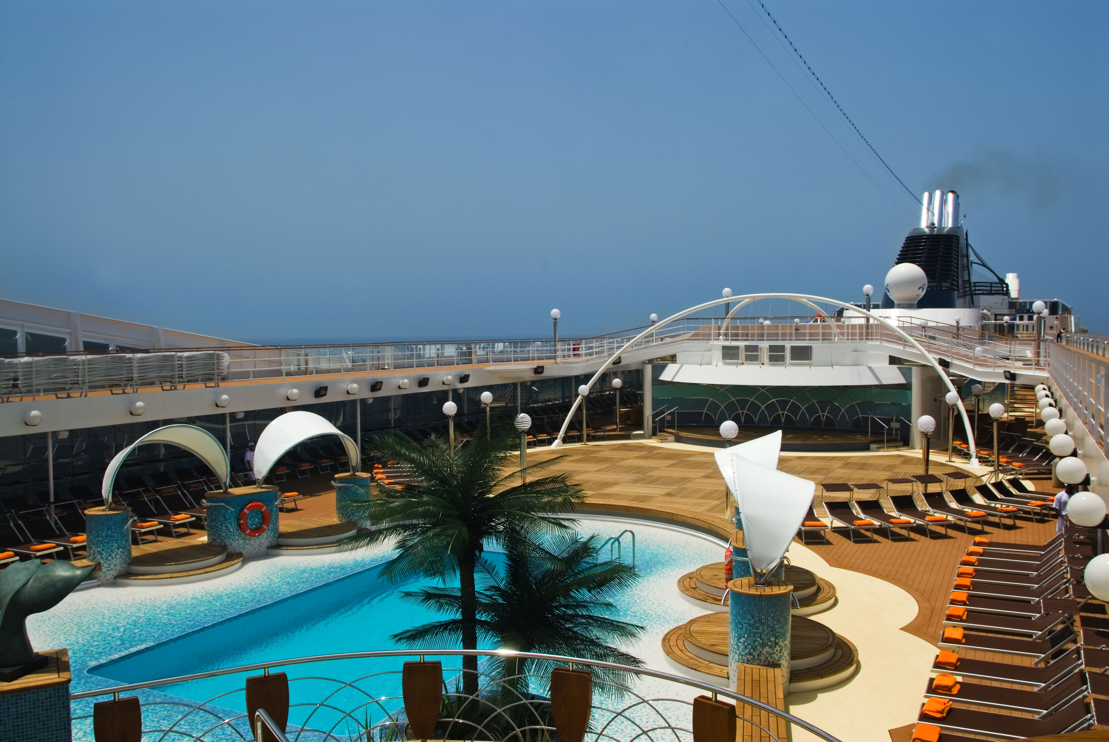 På pooldäck väntar flera sköna pooler och jacuzzis och filmvisning efter mörkrets inbrott.