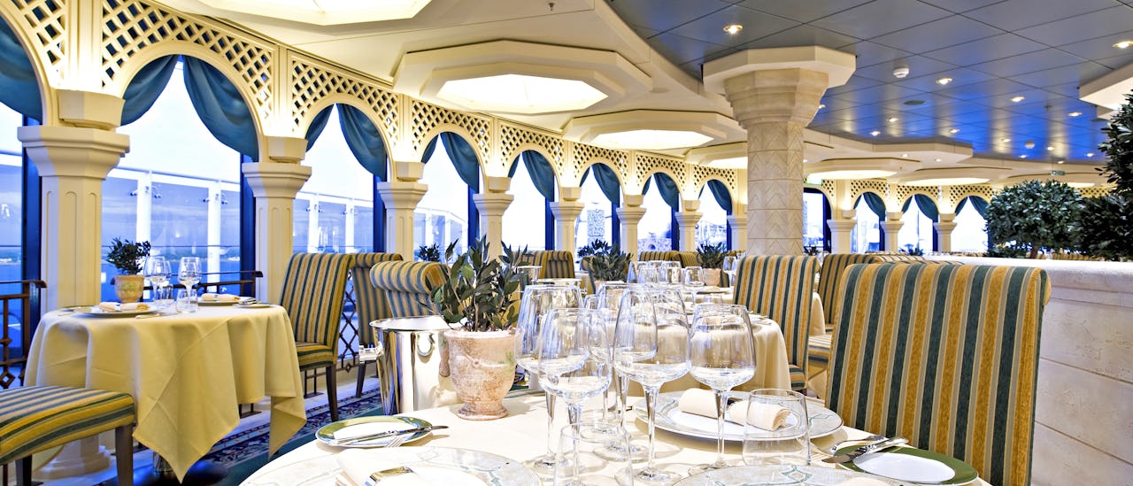 À la carte- och bufférestaurangerna ingår i kryssningsbiljetten. Förvänta dig många matupplevelser från länderna runt medelhavet.
