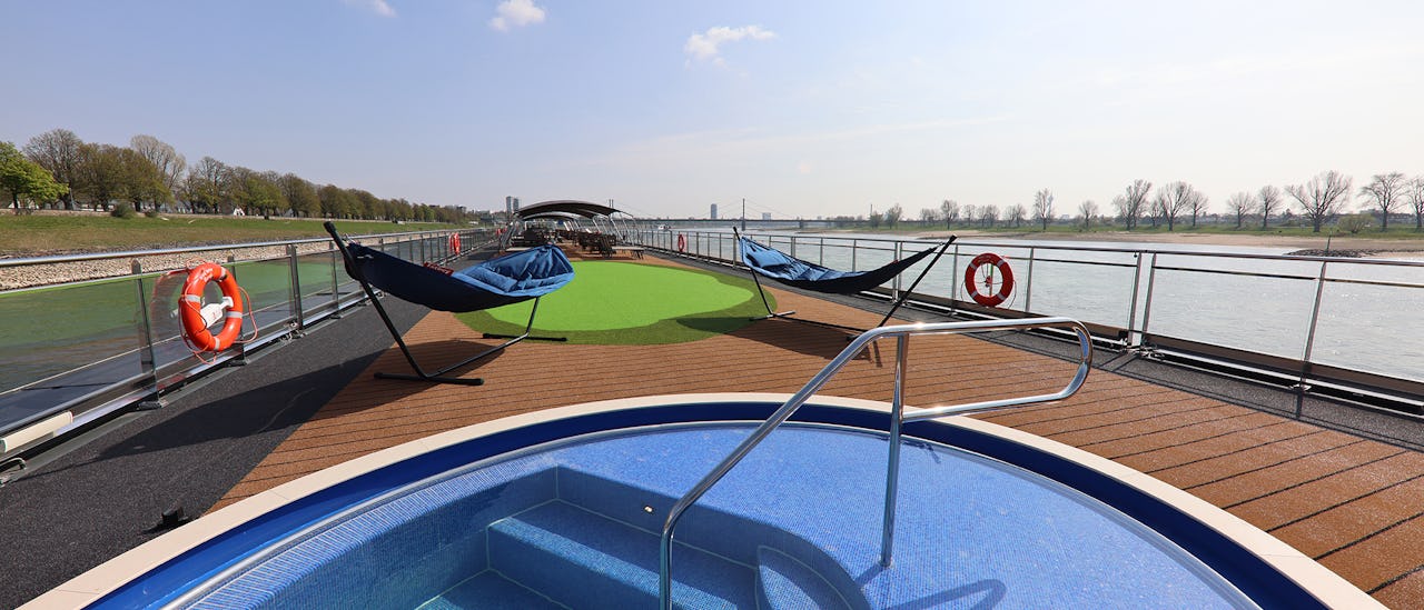 På soldäcket kan du spela golf på puttinggreen eller koppla av i den härliga, varma bubbelpoolen och i hälsocentret kan du njuta av bastu och ångbad. Ombord finns också cyklar så att du kan utforska staden på cykel vid varje stopp i land.